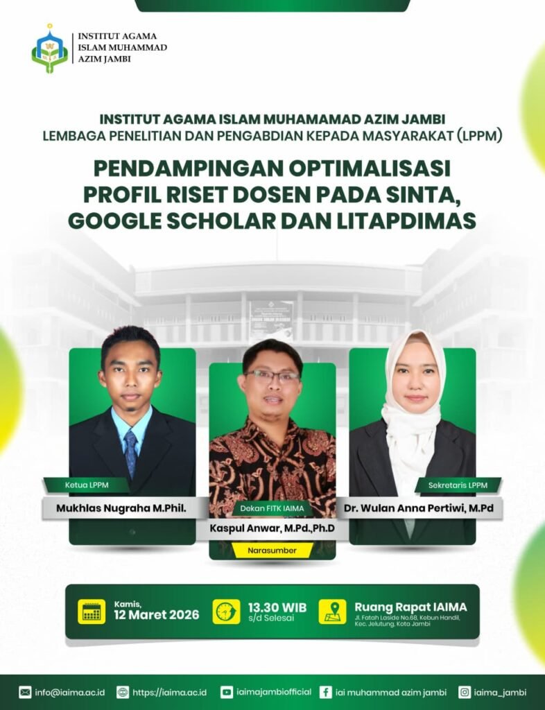 Jambi – Lembaga Penelitian dan Pengabdian kepada Masyarakat (LPPM) Institut Agama Islam Muhammad Azim (IAIMA) Jambi menyelenggarakan kegiatan “Pendampingan Optimalisasi Profil Riset Dosen pada SINTA, Google Scholar, dan Litapdimas” pada Kamis, 12 Maret 2026, bertempat di Ruang Rapat IAIMA Jambi.